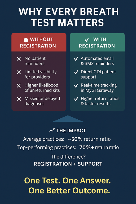 Unreturned or unregistered breath test kits don’t just represent a logistical issue — they represent missed diagnoses and clinical context, delayed care, and unnecessary burden on both patients and practices. Ensuring every test ordered leads to a valid test result is an essential part of Breath Testing Done Right.